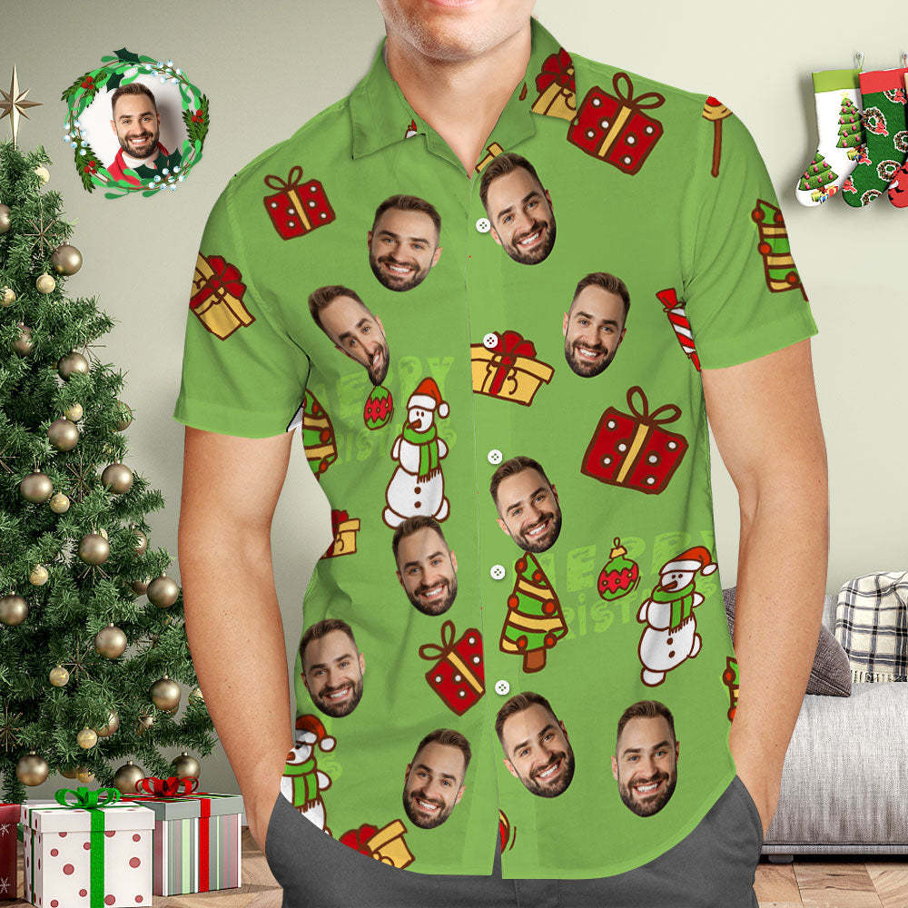 Custom Face Hawaiian Shirt Personalized Photo Green Hawaiian Shirts Snowman and Christmas Gift for Him	 - FaceSocksUSA