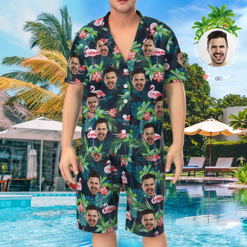 Custom Face On Pajamas Set, Short Sleeve Sleepwear, Button-Down Nightwear - Leaves & Flamingo